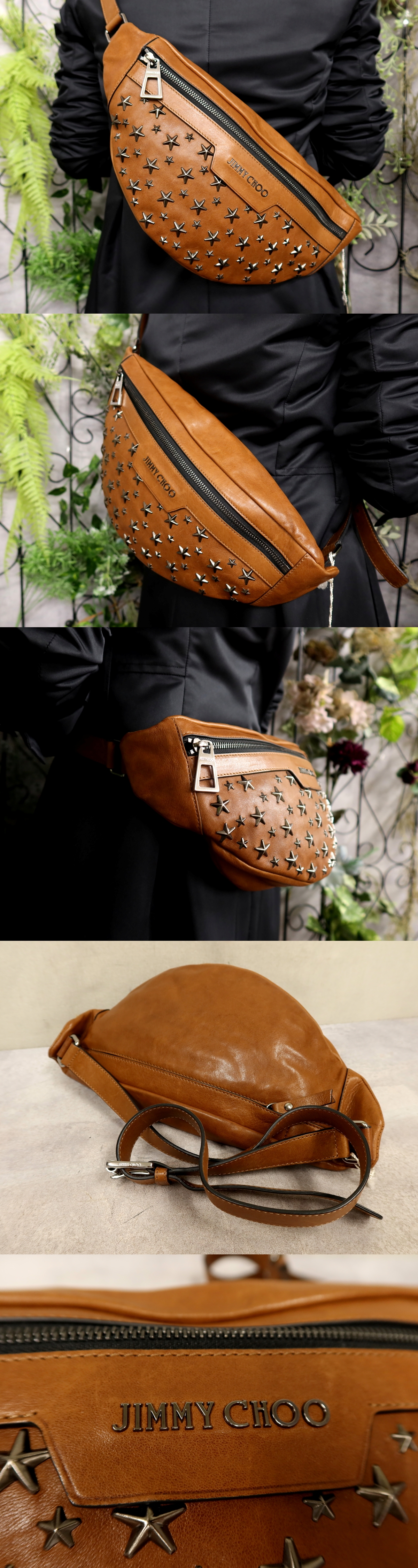 ●超美品●ジミーチュウ●メンズ●デリー●スタースタッズ●カーフ レザー 本革●ウエスト ボディ バッグ●ブラウン●SV金具●Js61663