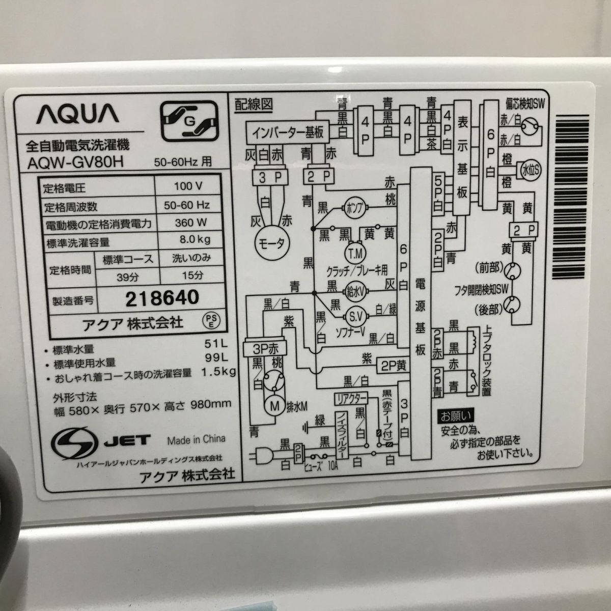 洗濯機 8.0kg AQUA アクア 2019年製 AQW-GV80H 直接お渡し歓迎 GCK866755埼 收藏