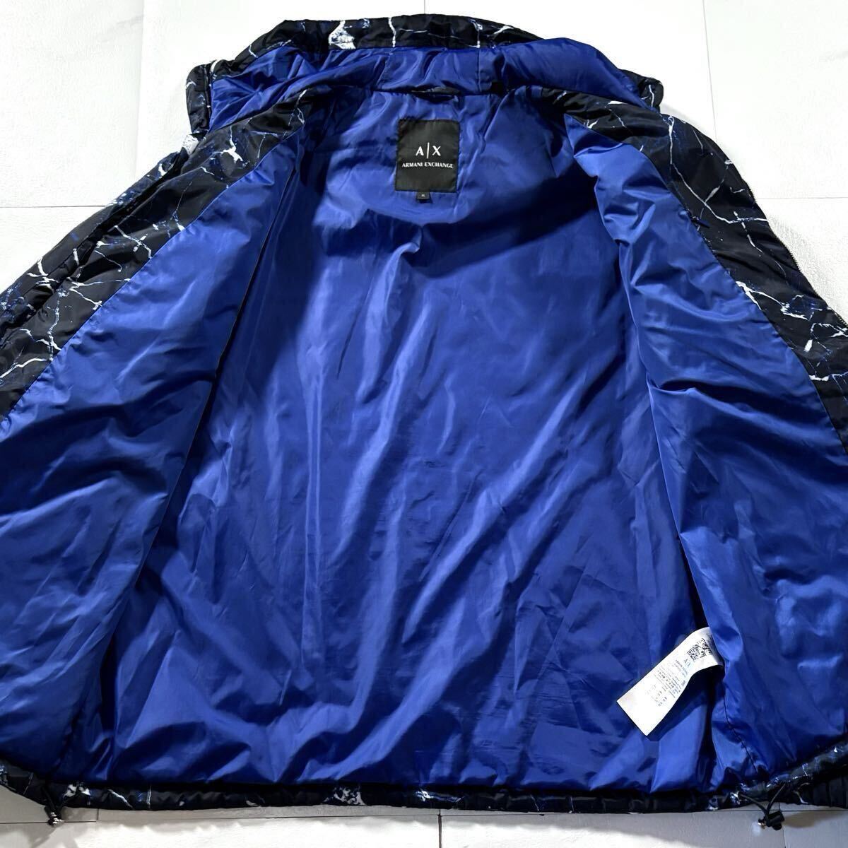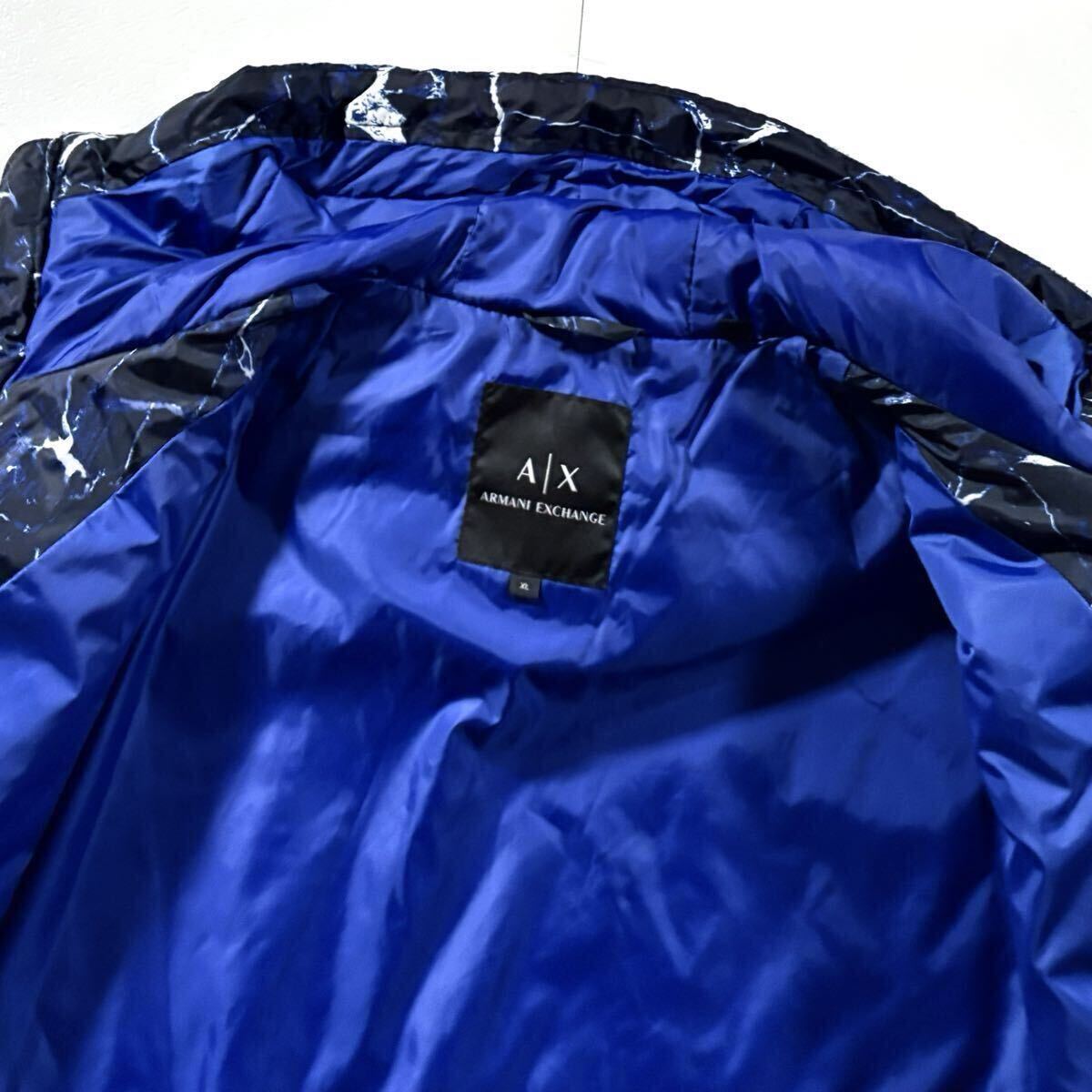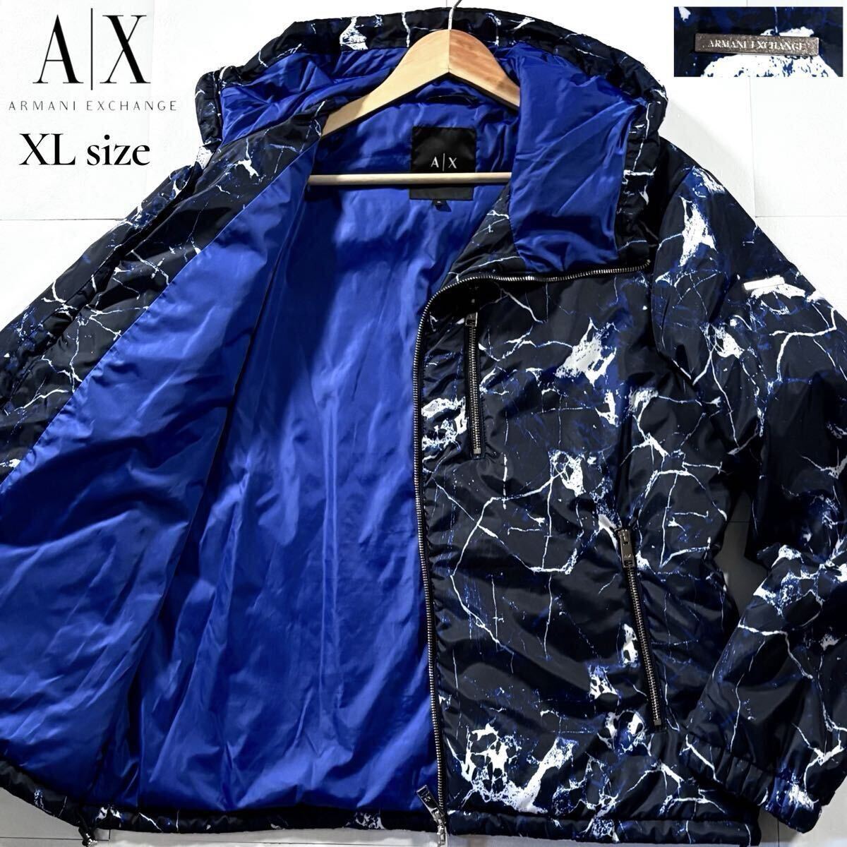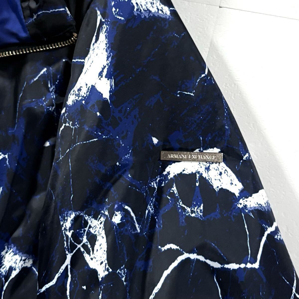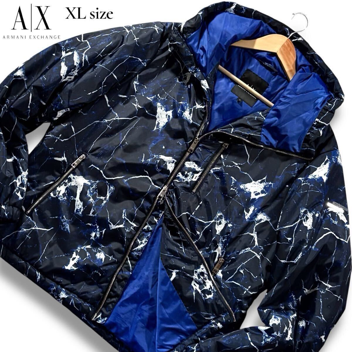 未使用級/XLサイズ●ARMANI EXCHANGE アルマーニ エクスチェンジ ダウンジャケット エコ 中綿 ダブルジップ 総柄 ロゴ金具 洗濯可能 裏地青 收藏