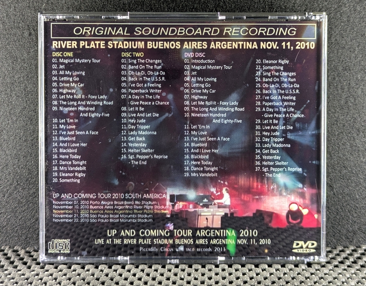 2010年に始まったUP AND COMING TOURは当初の予想に反して年間を通した長期のツアーにな り、11月では南米にて全5公演の日程が組まれました。特にアルゼンチンのブエノス アイレスとブラジルのサンパウロの2都市では、それぞれ2連続公演、南米の熱狂的な 聴衆を前に大会場でのコンサートが行なわれました。本作はその翌日、アルゼンチンの二日目、2010年11月11日のコンサー トに加え、映像ディスクをカップリング!まずはオーディオディスクの目玉は、何といってもウイ ングス『BAND ON THE RUN』に収録の「BLUEBIRD」です。1976年のツアーを最後に24 年間演奏されることのなかったこの曲を、実に四半世紀ぶりにステージで演奏!! この一曲だけでも本作の価値あるレア・ナンバー!3枚目に映像ディスクではこの日のコンサートを収録。音と映像の豪華カプリングで当日のコンサートを存分にお楽しみ頂けます!