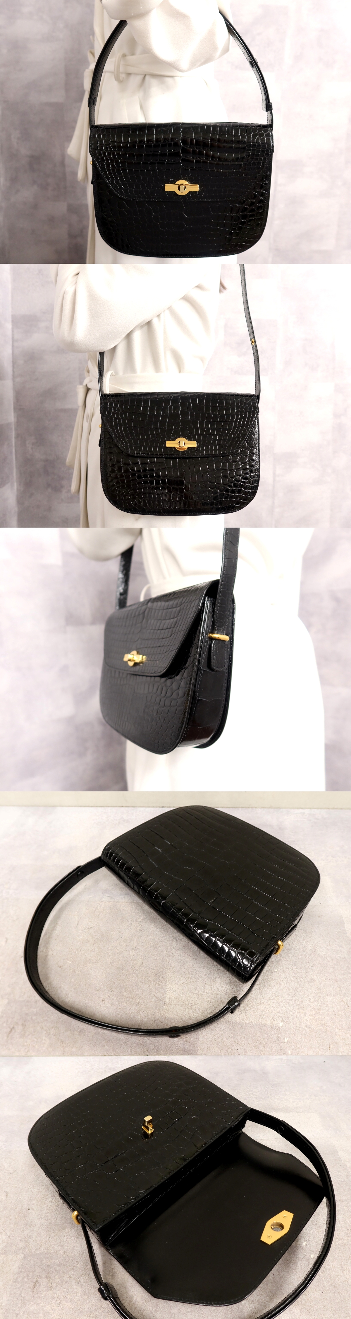 ●超美品●GENUINE●フラップ●シャイニング クロコダイル 本 ワニ 革●ハンド バッグ●黒●ゴールド金具●腕掛け●収納 かばん●Js64407 收藏