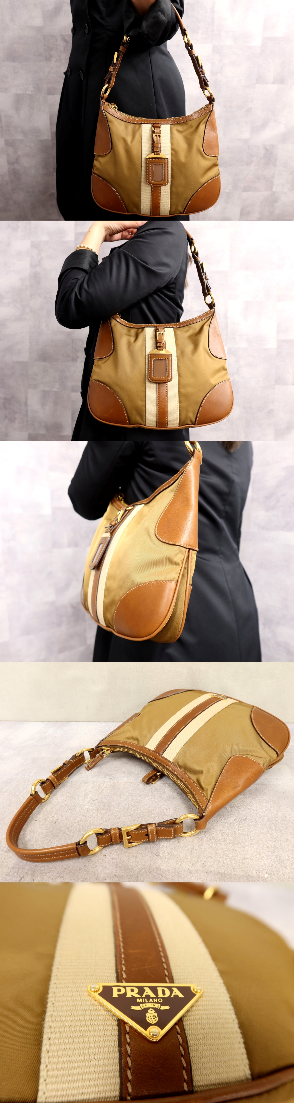 ●超美品●PRADA プラダ●三角ロゴプレート●ポコノ ナイロン カーフ レザー 本革●ショルダー バッグ●ブラウン系●ゴールド金具●Js65147 收藏