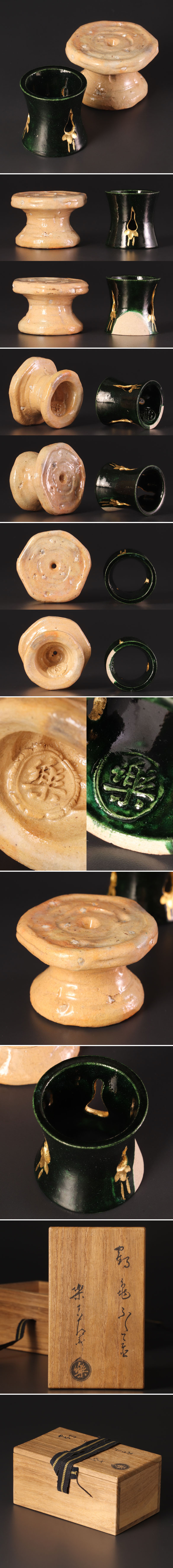 長寿を象徴する瑞獣を対照的な意匠で表現した、二客組の蓋置です。 亀に見立てた一品は、力強い渦文が施された六角の造形に、落ち着いた風格が漂います。一方、深い緑釉の一品は、側面には鶴の形を模した透かし彫りが金彩と共に三箇所施されています。 いずれも底部には「楽」の印が鮮明に捺されており、伝統の系譜を感じさせる確かな風格を備えています。慶事や取り合わせの妙を愉しめる、格調高い一対です。 ★商品は十三代楽吉左衛門(惺入)の作品である事を保証致します。 |