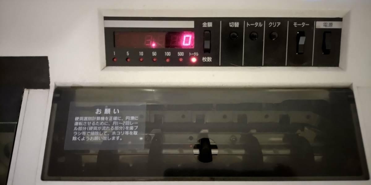 日本硬貨分別計数動作/表示確認済、中古現状了解の方に。 付属品100V電源アダプター。定形外を選び、クロネコ送料着払発送、金種ごと分別 金種ごと枚数表示、金種ごと金額表示、全金種の総額表示。