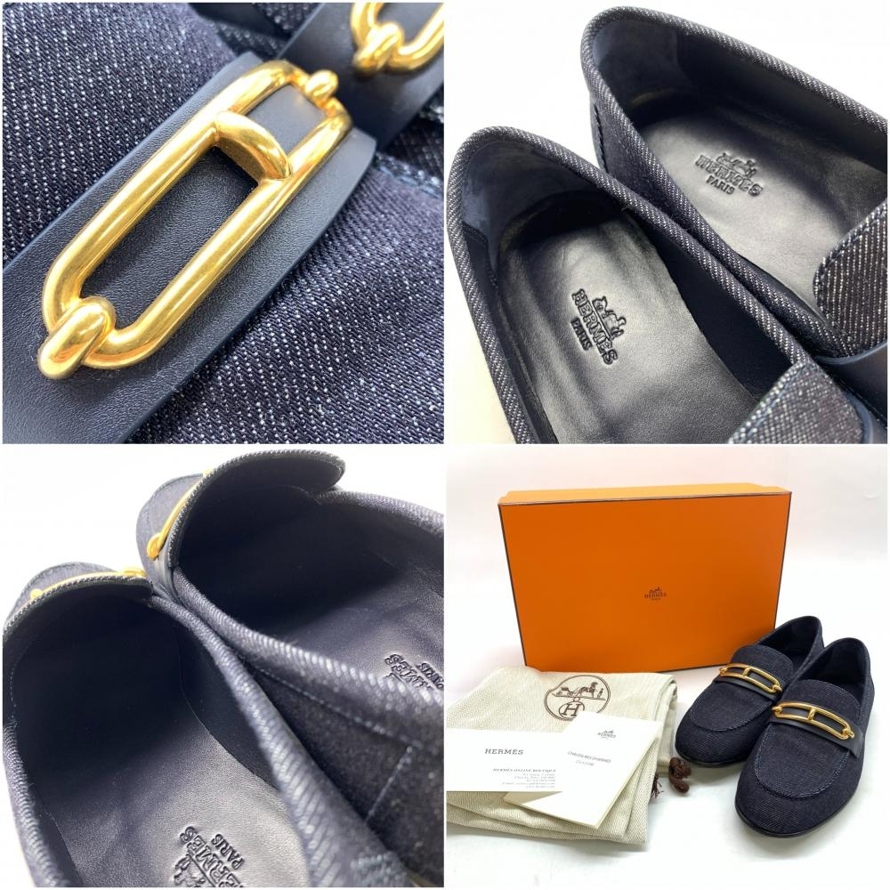 象徴的なエイジドゴールドメッキのルーリスバックルを備えたデニムローファーです。デニム素材はカジュアルな印象ですが、長めのノーズと細身のシルエットがエレガントで、綺麗めなフラットパンプス感覚で履けるのでフェミニンなファッションにもおすすめです。