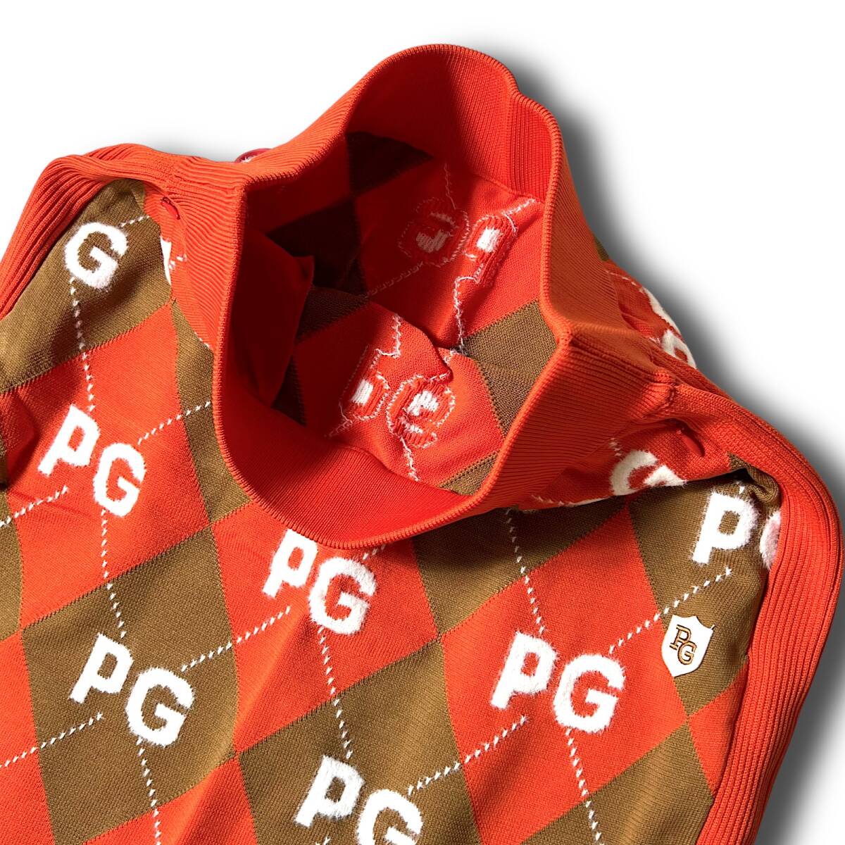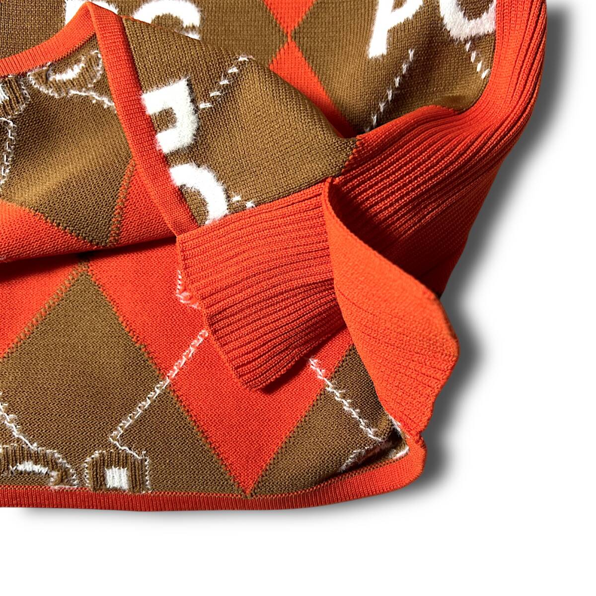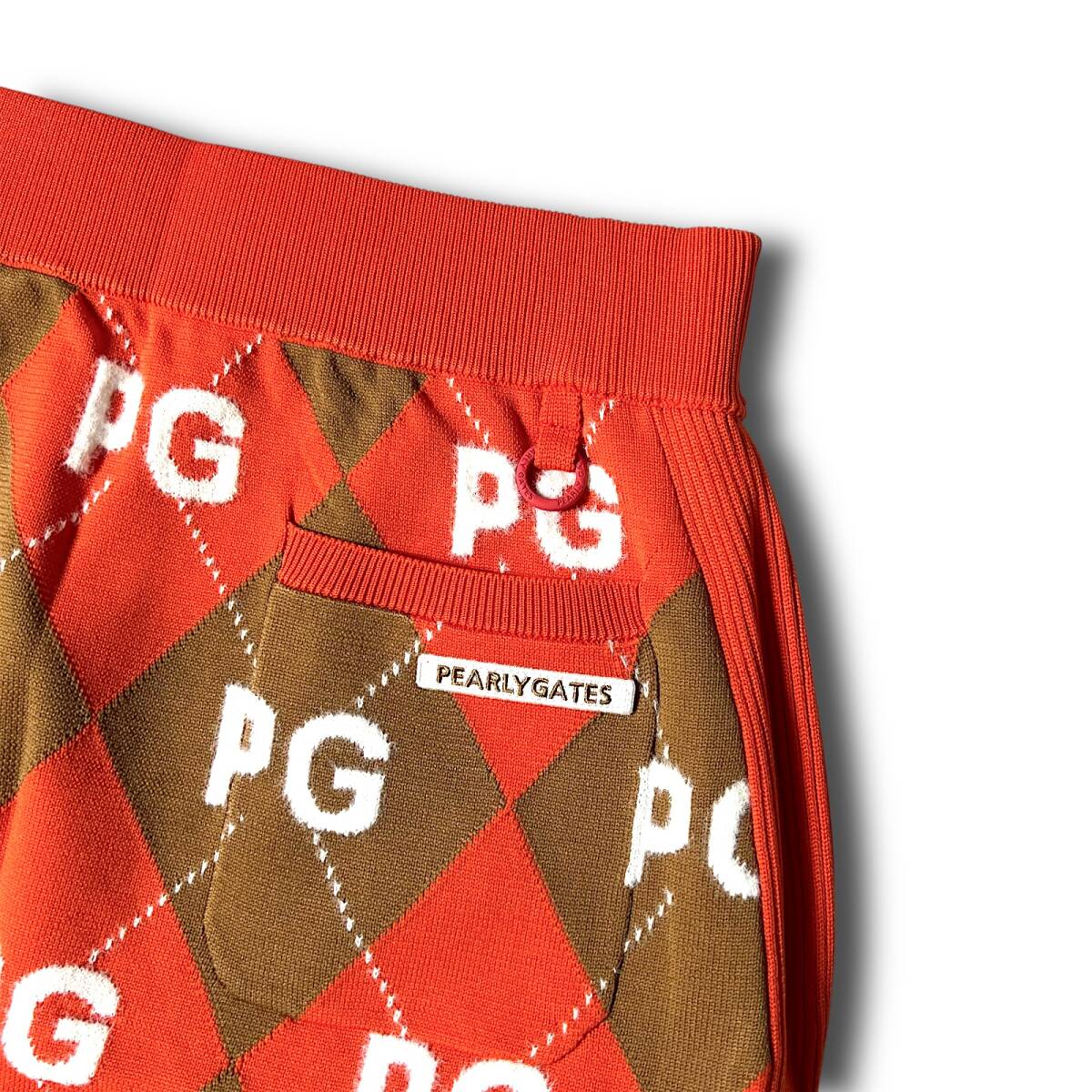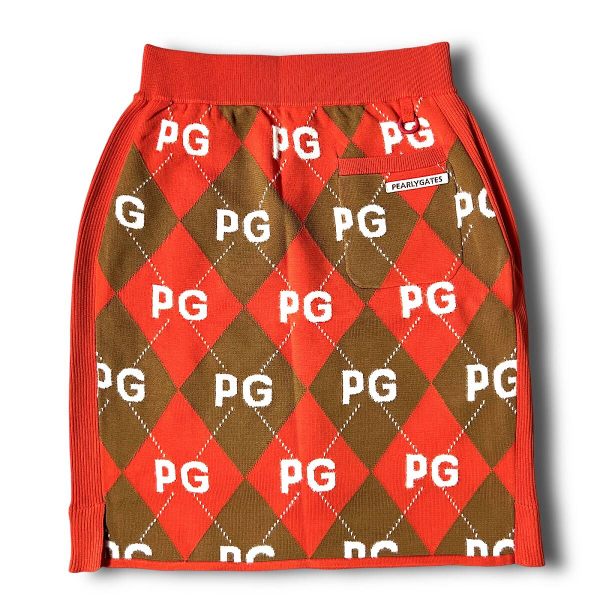 タイトル 新品 PEARLY GATES パーリーゲイツ アーガイル PG 総柄 スカート 7ゲージインターシャ アーガイル柄 PG刺繍 リブニット切り替え ストレッチ ミドル丈 ゴルフスカート ゴルフウェア レディース GOLF スポーツ レジャー オレンジ系