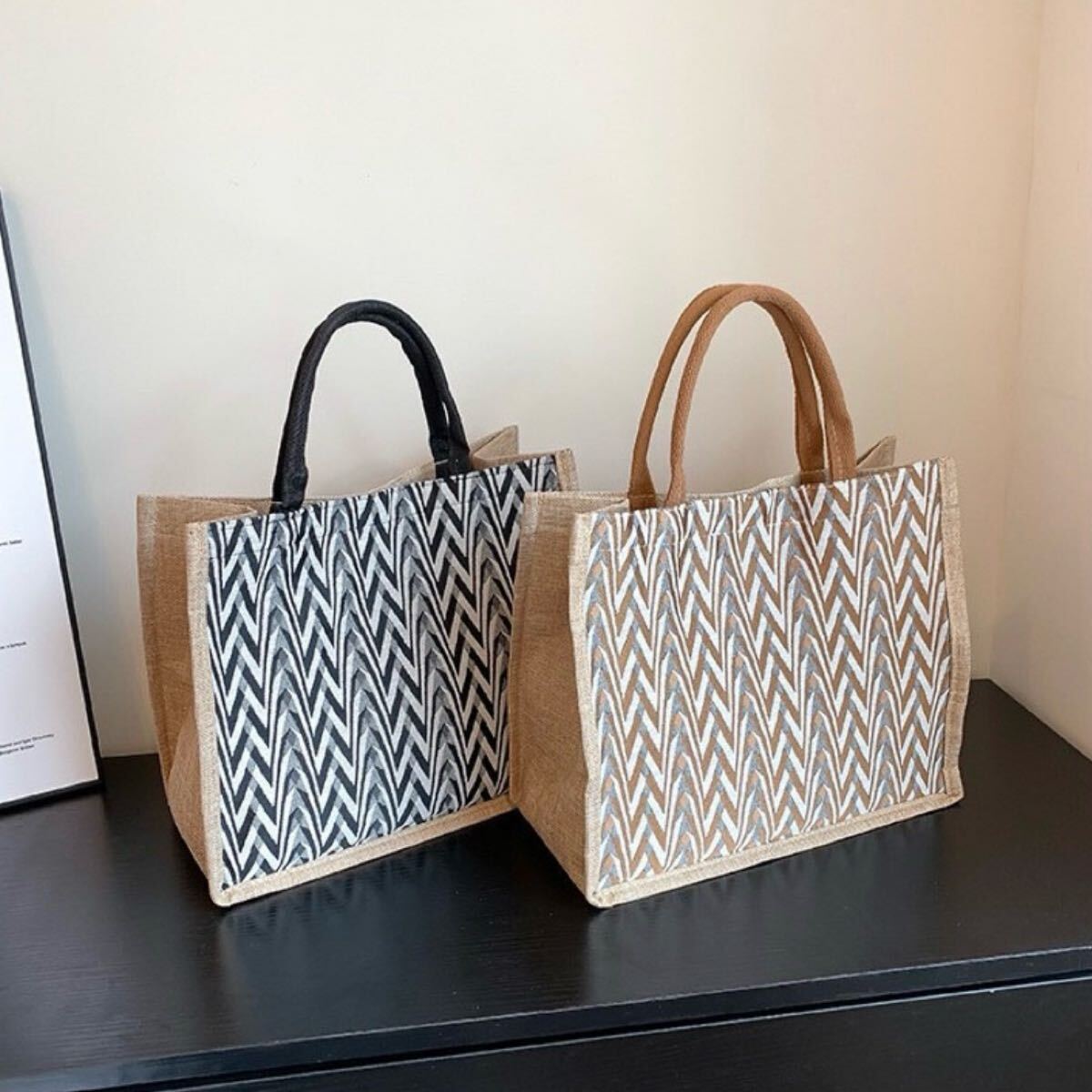 91*新品* 幾何学模様 ジュート生地 トートバッグ ベージュ×ブラウン