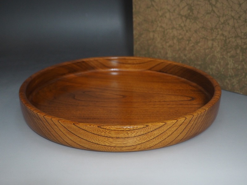 C0583 木製 刳り貫き 丸盆 化粧箱付 ☆ 茶道具 抹茶器 抹茶道具 茶懐石 茶事 和食器 木製 木工芸 杢目 木目 盆 茶盆 運び盆 美品 良品 無傷