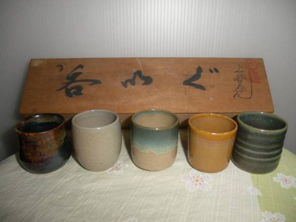 | 上野焼十時窯十一代の甫硯作 食い呑みの5個の出品です。 10年前、古民具屋さんで、購入しました。 とっても上品なぐい飲みです。煎茶湯呑としても使えそうです。 形いろいろ サイズも微妙に違っています。ご理解ください 色んな色合いと形を楽しめますよ。 甫の銘印と上野の窯印あります。 ぜひお手にとられてごらんください。 共箱は、経年のいたみ有り。 サイズ 口径4.2cm 高さ4.8cm 口径4.4cm 高さ4.6cm 口径4.4cm 高さ5.1cm | |||