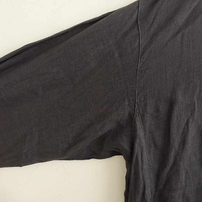 | nest Robeのリネンスキッパーネックロングワンピースです。カラーはダークグレーで、リネン地で仕立てられています。トップに1つボタン付きのプルオーバータイプで、タックがあしらわれ、両サイドにシームポケット付きです。 |