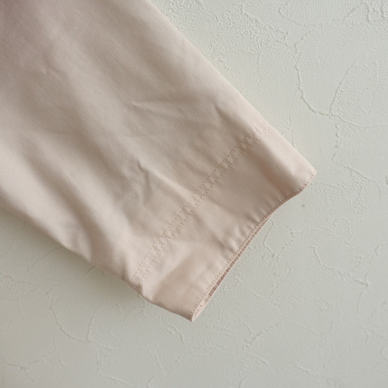 | Samansa Mos2 のステンカラーコートです。カラーは薄いくすみピンクで、ポリエステル×綿混紡のツイル地です。フロントボタンで着脱でき、袖口に留め具は無いデザインです。前腰左右にフラップ付きポケットがあり、ライトブルー×ホワイトのストライプ柄の裏地付きです。 |
