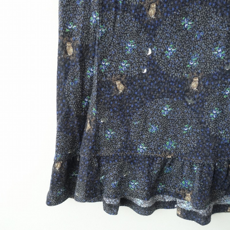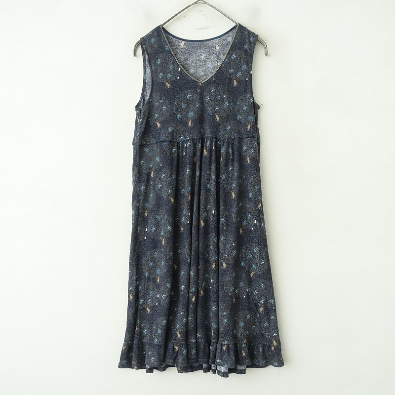 | franche lippeeのVネックふくろうプリントノースリーブカットソーワンピースです。カラーはネイビー、ブラック、グリーン、ブラウンなどで、ふくろうなどのプリントの施されたカットソー地で仕立てられています。Vネックのプルオーバータイプで、ネックラインやステッチはゴールドのラメ糸が使用されています。 |
