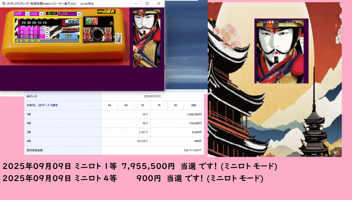 [的中LOTOチェッカー戦国激闘battleレビュー今川義元2025]09月09日 ミニロト ~四万の兵ぞよ~ 総合点77 義元「買えぞとな」