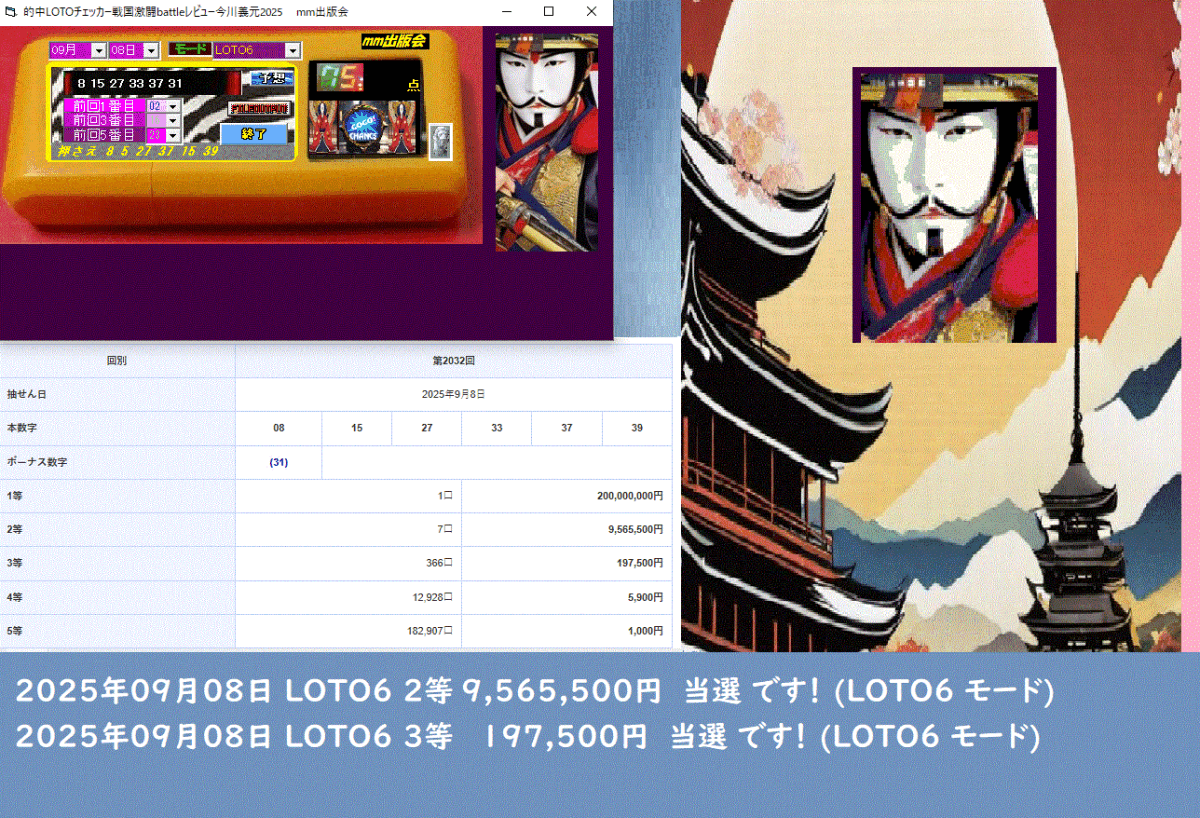 [的中LOTOチェッカー戦国激闘battleレビュー今川義元2025]09月08日 LOTO6 ★GOGO★勝負日! 義元「駿河によ我こそおれ・・・」 総合点75 義元「買えぞとな」