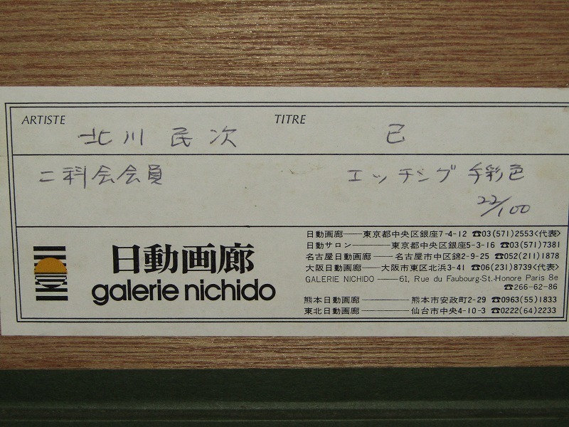 【真作】北川民次 エッチング 手彩色「巳」額装 直筆サイン エディション 日動画廊シール 銅版画 ij17-8380[GGG] 收藏