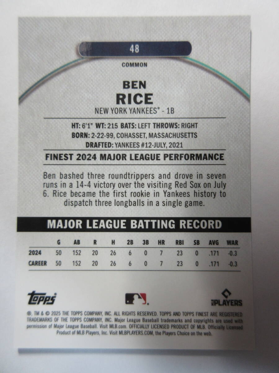 Topps社発行の、「2025 Finest Baseball」に封入されていた、2021年ドラフト12巡目(全体363位)でヤンキースから指名を受けプロ入り、2024年7月6日レッドソックス戦で1試合3本塁打を記録、ルーキーとしてヤンキース史上初、また7打点はルー・ゲーリックと並ぶヤンキースのルーキー記録、本年5月11日アスレチックス戦ではキャリア初の満塁本塁打を放った期待の新人ベン・ライス選手、貴重な50シリ・ゴールド・リフラクター版・コモン・ルーキーカードです。| 出价者 | 信用 | 价格 | 时间 |