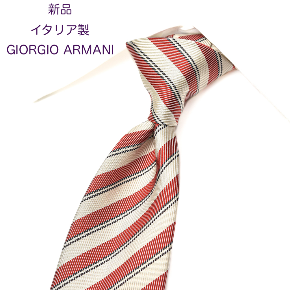 【新品・イタリア製】GIORGIO ARMANI・シルク 100%ベージュ×レッド系レジメンタル柄ネクタイ