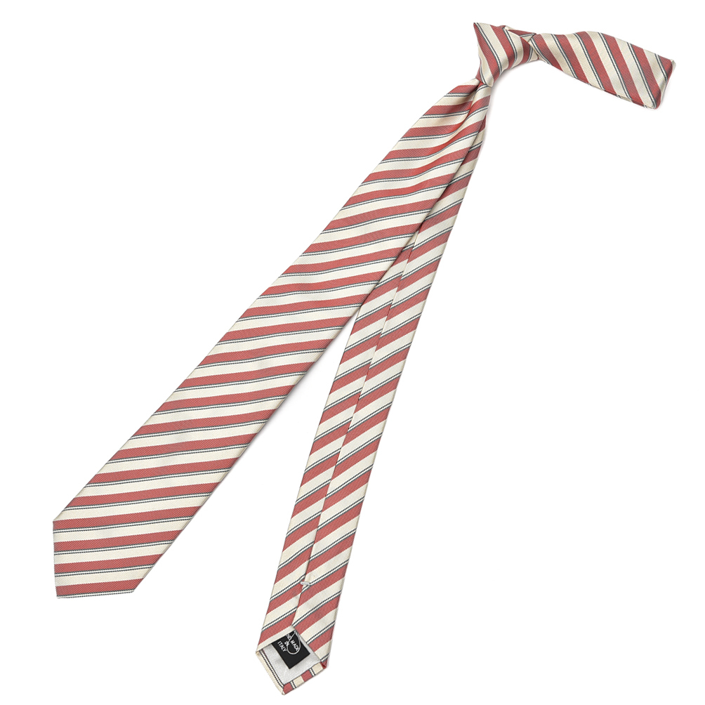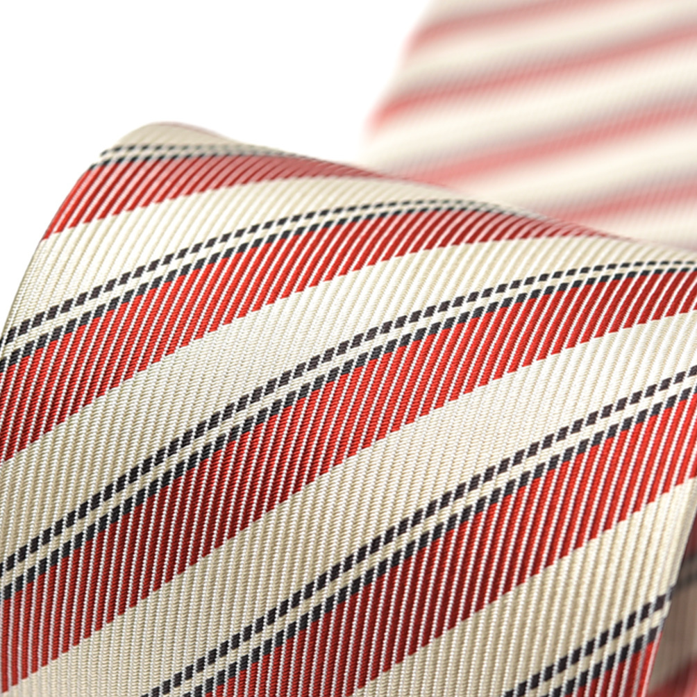 シルク 100%ベージュ×レッド系レジメンタル柄ネクタイです。