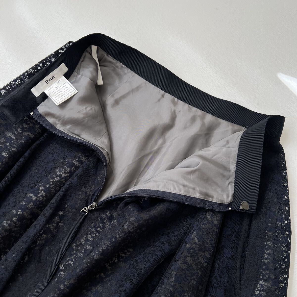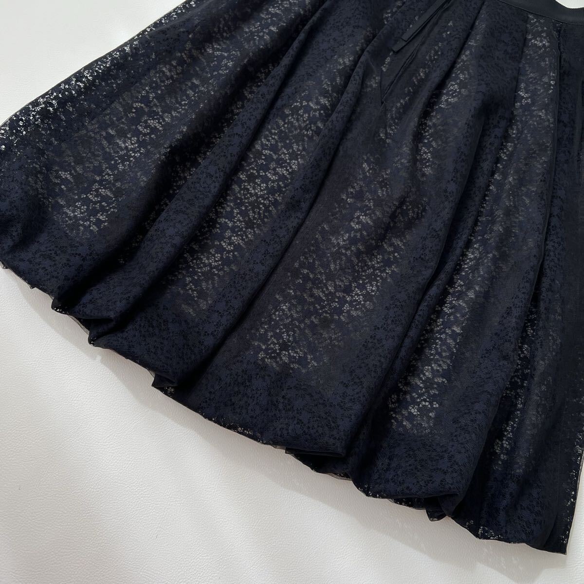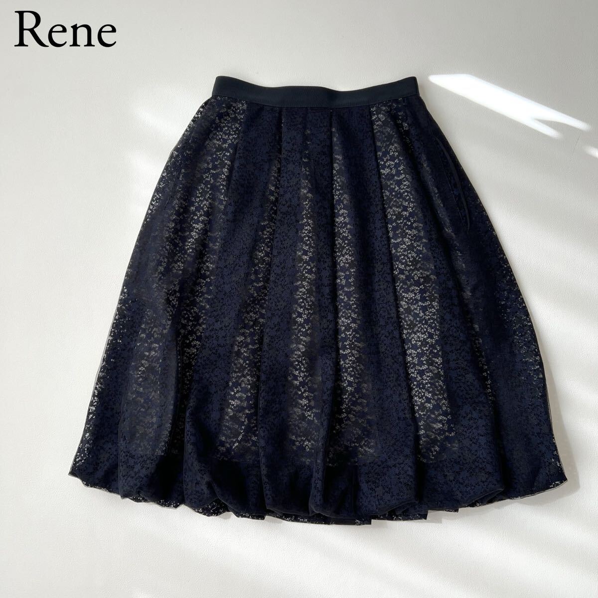 美品 Rene ルネ バルーンスカート ボックスプリーツスカート ネイビー フラワー模様 チュール レース 膝下丈 ミディ丈 34 レディース 收藏