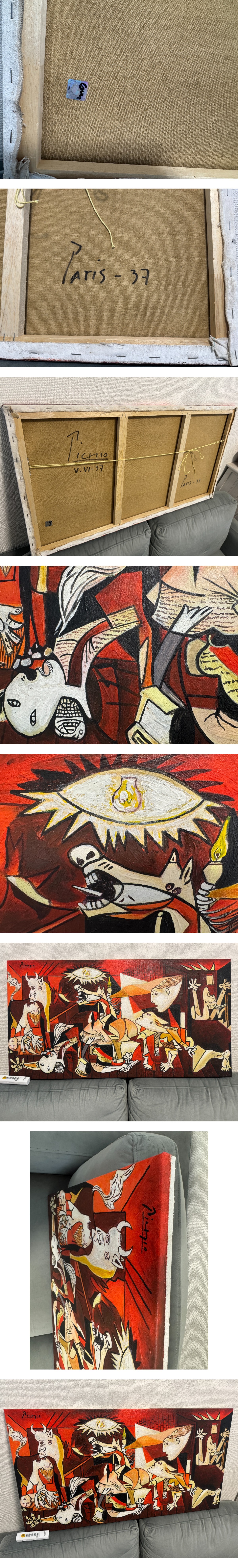 | 【特別出品】パブロ ピカソ Picasso 手書き 貴重肉筆 大型「 ゲルニカ」習作 油彩画 ホログラムシール 裏にサイン「模写」 | |||