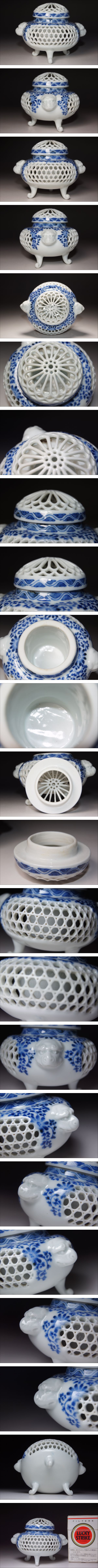 平戸焼 染付 唐花文 透彫 獅子耳 香炉 菊花彫透かし火舎 三足 箱無 三川内焼 獅子双耳 透かし彫り 透かし蓋 香爐 香道具 | ||||||||
