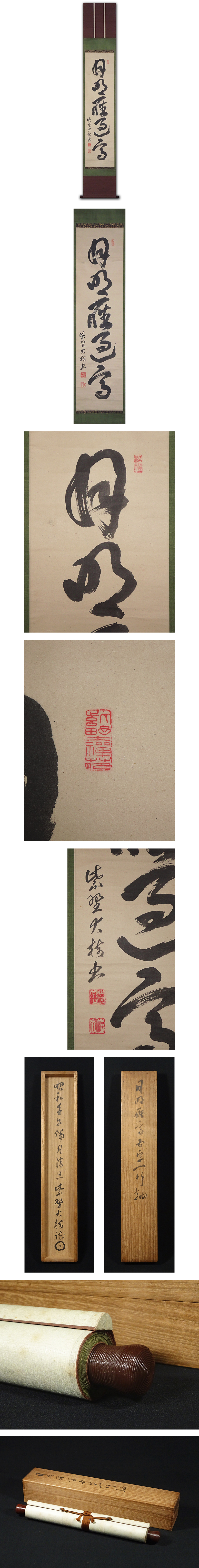 慶應◆大徳寺489世【晦巌常正(太田常正・大梅窟)】真筆 紙本墨蹟 五字一行書『月明雁過高』掛軸 共箱 茶掛 茶道具 收藏