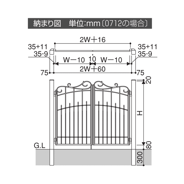 | 仕様・サイズ | 全幅141cm(扉60cm×2)X高さ120cm ▼通常仕様 ・扉の開閉方向:内開き(家側へ開く)仕様 ・打掛け錠 (外/内:簡易錠) | |