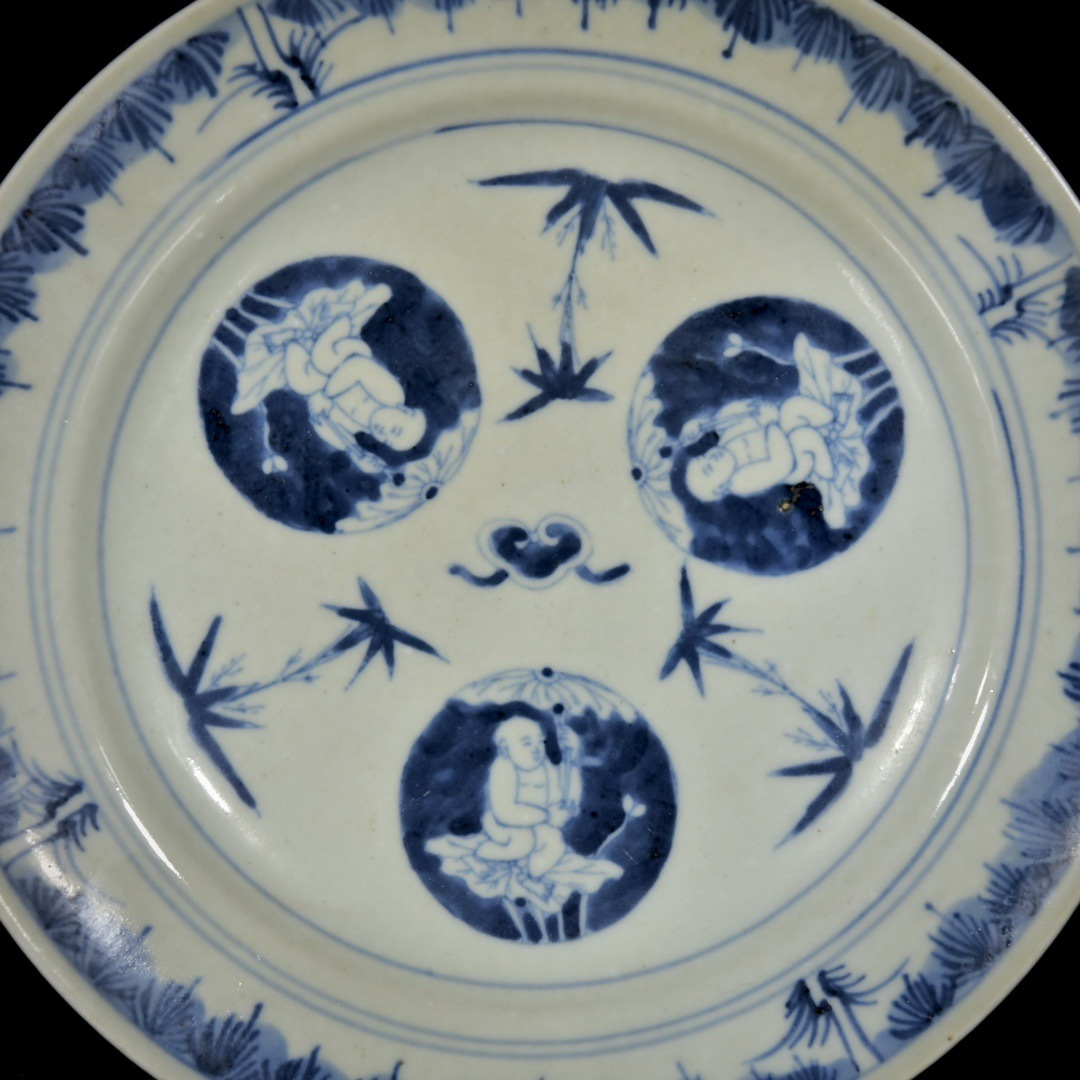 PTA#1232【3.1】中国骨董 人間国宝 磁器【青花童子が蓮の皿で暴れます】工芸品 施釉陶 青花磁 陶芸 精美彫 置物 收藏品 收藏