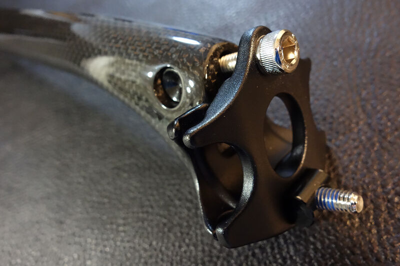 ■製品仕様 ・材質:本体/T800 3Kドライカーボン グロスフィニッシュ ヤグラ/冷間鍛造アルミ ボルト/クロモリ(クロームメッキ) ・SIZE:ポスト径/27.2㎜ 全長/350mm(クランプ部中央~後端) ボルト/5㎜六角レンチ(2ボルトクランプ※前のボルトを指でつまんで回して角度調整、後のボルトで締め付け固定) ・サドルオフセット:20㎜ ・重量:180g前後 ★非常に軽量かつ頑丈な3Kドライカーボン製シートポストです。2ボルト式により強固な固定と無段階の角度調整がスムーズ、正確に行えます。 ★軽量なサドルとの組み合わせで非常に軽快なダンシングが可能です。 ドライカーボンの特性により路面の凹凸による突き上げを吸収緩和しアルミ製に比べ乗り心地が向上します。 ★グロスフィニッシュ3Kドライカーボンの高級感と織目がスタイリッシュでミニマルなデザインはあらゆるフレームやパーツにマッチします。 |