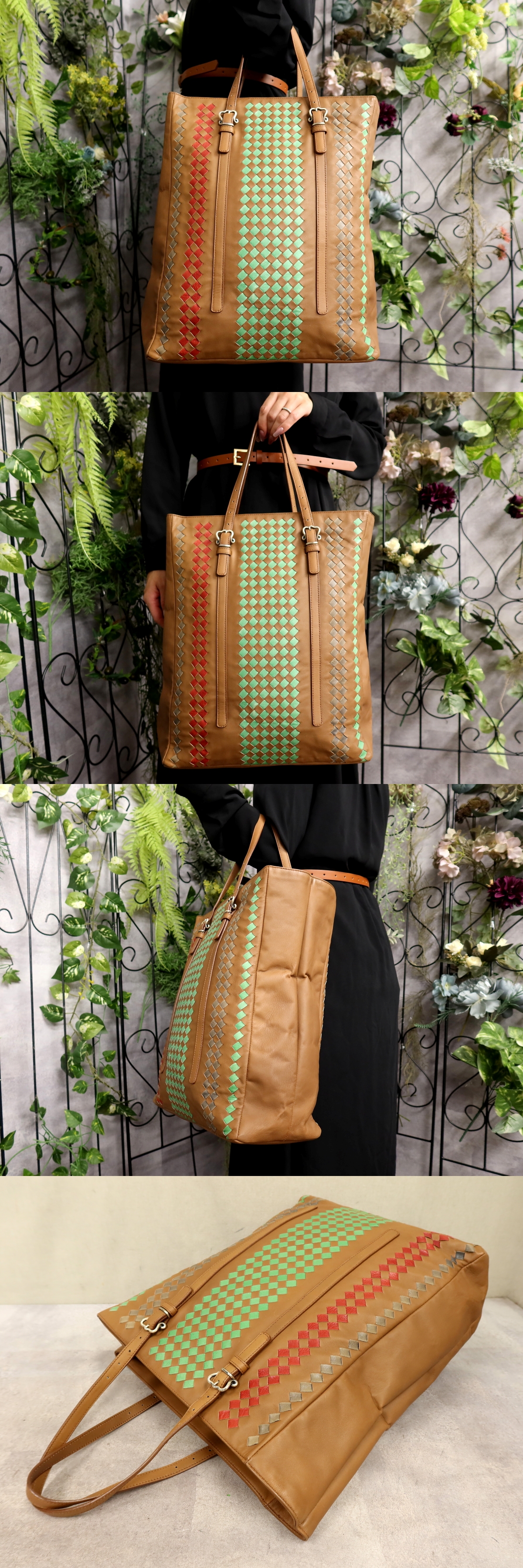 ●超美品●BOTTEGA VENETA ボッテガ ヴェネタ●イントレチャート●カーフ レザー 本革●トート バッグ●茶 緑 赤●A4 収納 かばん●Js61514 收藏