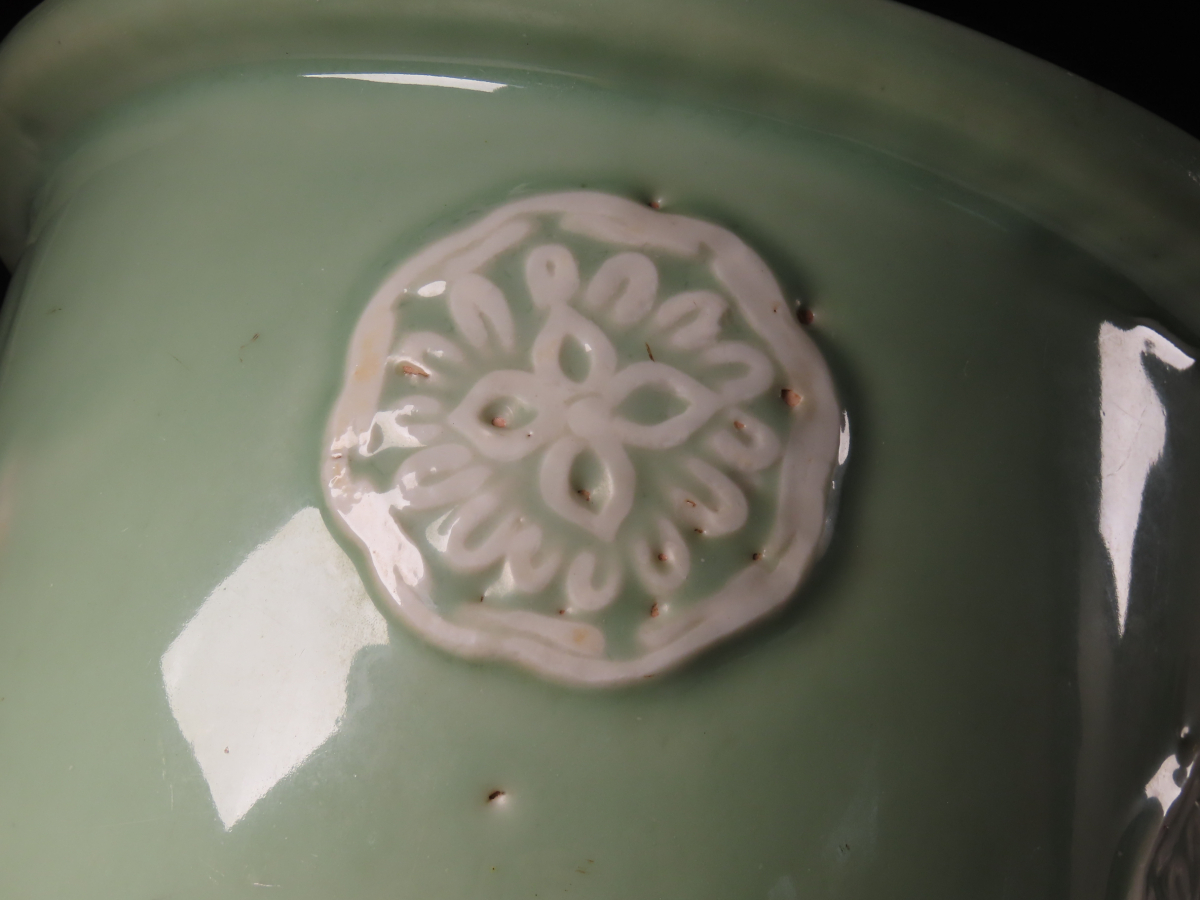【ONES】古美術 時代本歌 瀬戸 尾張 最高峰作品 青磁貼花陽刻盛上花唐草丸文三足丸鉢 径31cm 盆栽鉢 植木鉢 古美術品 收藏