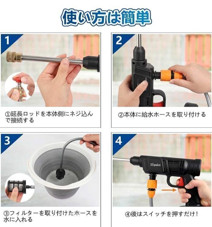 【豊富な付属品】■パッケージ内容:高圧洗車機*1、バッテリー*2、充電器*1、ステンレス鋼延長ロッド*1、0°ノズル*1、40°ノズル*1、クイックコネクタ*1、ボトルコネクタ*1、給水ホース*1、自吸式フィルター*1、ソープポット*1、収納ケース*1。