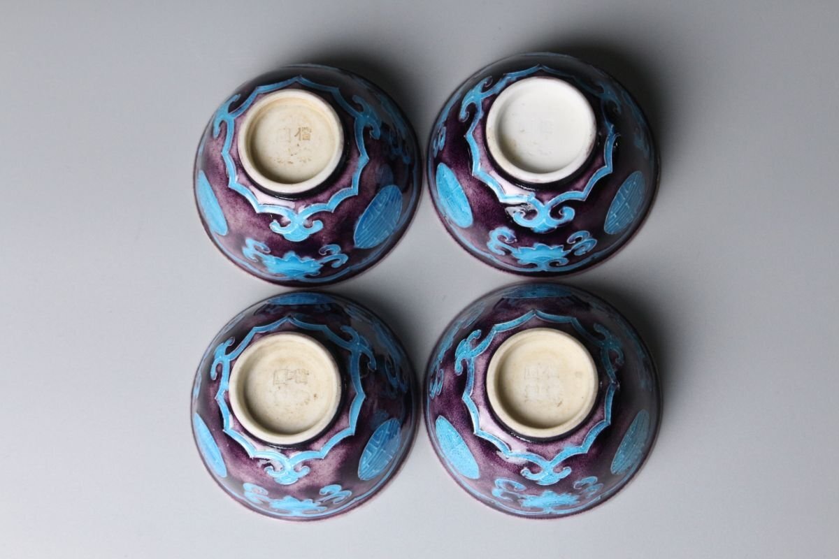 LIG】紀州徳川家御庭焼 偕楽園製 紫交趾壽字丸文煎茶碗 四客 箱付 古美術品 資産家収蔵品[.I]25.10 收藏