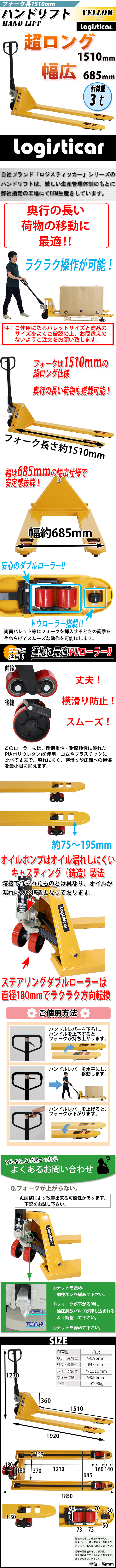 送料無料 ハンドパレット 超ロング 幅広 幅685mm フォーク長さ1510mm 3000kg ハンドリフト ハンドリフター 3t ハンドトラック 黄 收藏