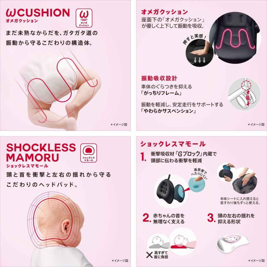 【商品特長】 ●アップリカの「ラクーナクッションAG」は、生後1カ月から使える軽量5.3kgの両対面オート4輪ベビーカーです。 ●「がっちりフレーム」と「やわらかサスペンション」からなる振動吸収設計に、ソファーのスプリングのような クッション「オメガクッション」を加え、ガタガタ道の振動から赤ちゃんのからだ全体を守ります。 ●衝撃吸収材Gブロックを内蔵したこだわりのヘッドパッド「ショックレスマモール」が、赤ちゃんの頭と首をしっかりと守ります。 ●赤ちゃんの様子を見ながら、片手で簡単にリクライニングできる「フィットリクライニング」を採用。 ●ベルトの付け外しがマグネットの力で簡単・スピーディーな「イージーベルト」で、乗り降りがさっとできます。 ●姿勢サポートパッドをそなえたメッシュ本体シート、通気性があり快適なメッシュベースシート、 風を通し熱をカットするWサーモメディカルシステムなど、ベビーファーストクラスなシート構造でココチよくお出かけ。 ●すっぽり覆えてしっかりガードする「カプセルマルチフード」、熱やホコリから遠ざける「ハイシート53cm」、 安定走行の「ダブルタイヤ」など赤ちゃんを守るための機能が充実。 ●前からも出し入れできる「フロントイン・ビッグバスケット」、片手で折りたたみできる「ワンタッチ開閉」、 赤ちゃんを乗せたまま対面・背面が切り替えられる「ハンドル切り替え」、対面でも押しやすい「オート4輪」など ママ・パパのカンタン&ベンリを強力サポート。 | |||||||||||||||