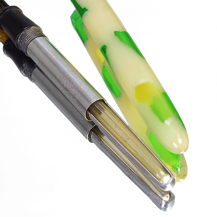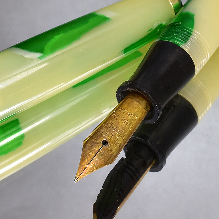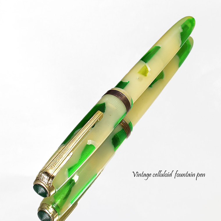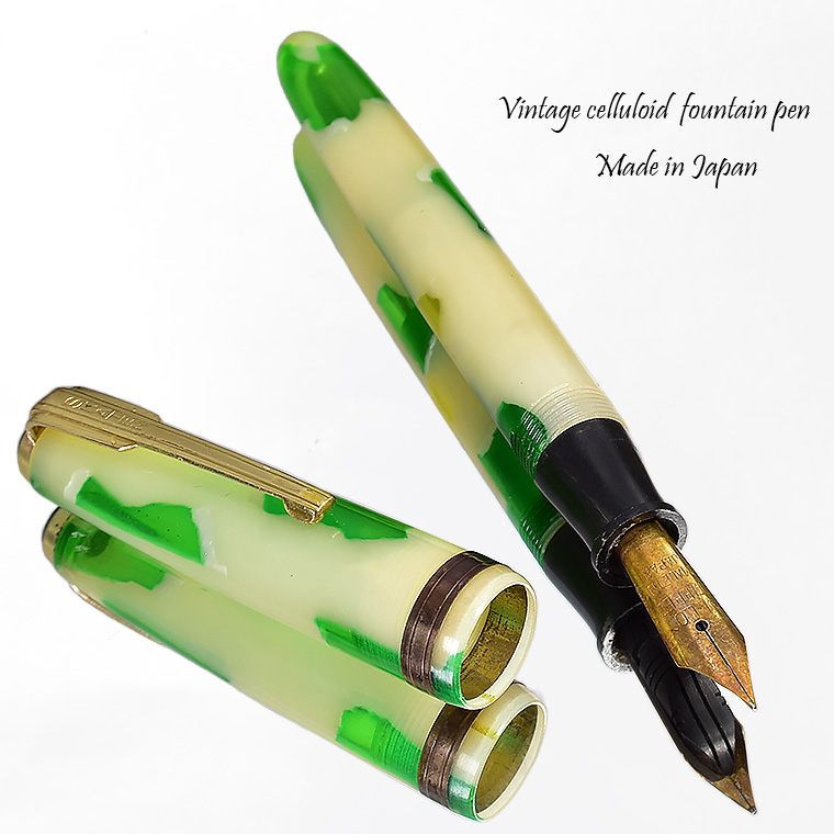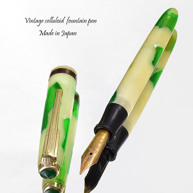 ■●ビンテージ セルロイド万年筆 職人が再生 希少な逸品 グリーン×イエロー モザイク EF 極細 中押し式 レトロ 調整済 1円~/K370LL 收藏