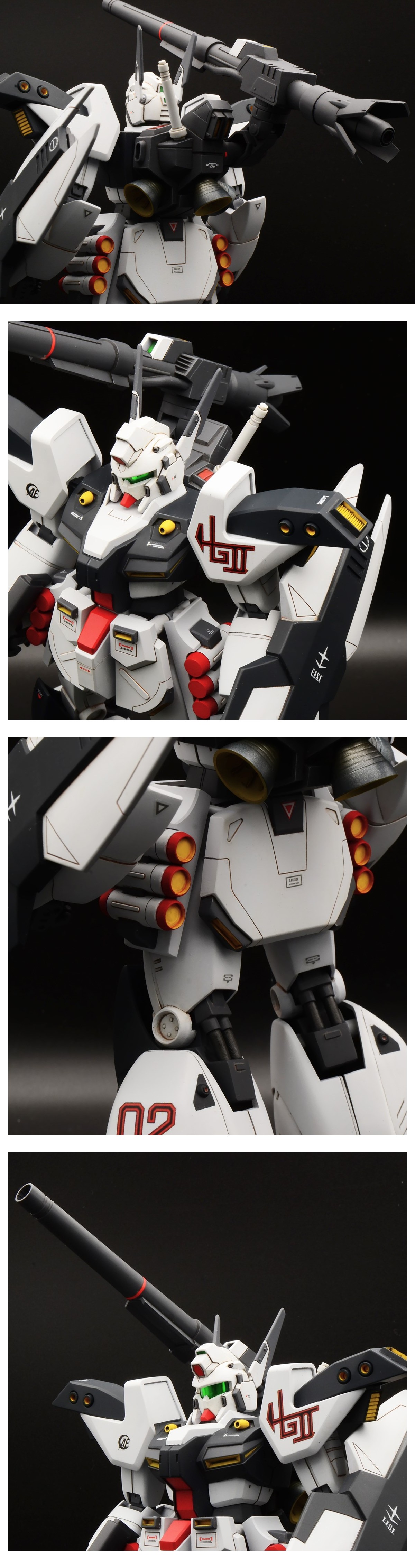 ●バンダイ製のキットを使用しています。●付属するものは写真に写っているものが全てです。●カタログ記載品のような綺麗な仕上がりをイメージして制作しています。●塗装前までの基本的な工作、パーティングラインや合わせ目の処理は可能な限り行っています。●一部にスジボリを追加しています。●足裏にディテールを追加しています。●肩や足の一部スラスターは別パーツに交換しています。●シールド裏にディテールを追加しています。●頭部バルカン先端及びライフル先端のディテールを追加しています。●ビームサーベルは刃の部分を透明パーツに交換しています。●ライフルやビームランチャーのレンズ部分はUVレジンを使用して透明パーツを追加しています。●下地処理は赤・黄部分にはピンク、白部分には白、他はグレイサフを使用しています。●基本塗装にはラッカー系を、細部には一部アクリル及びエナメル塗料を使用しています。●使用色は説明書指示に従っています。●バーニアノズルには焼き表現を軽く入れてあります。●スミ入れにはエナメル系のブラック、ブラウン、グレー、ピンクなどを使用しています。●付属のシールは使用せず、自作や市販のデカールに置き換えています。●すべての塗装工程終了後、クリアー部分以外はつや消しクリアーで軽くコーティングしてあります。●写真はなるべく実物の色味に近くなるよう努力しておりますが、多少の差異がありますこと何卒ご了承ください。
