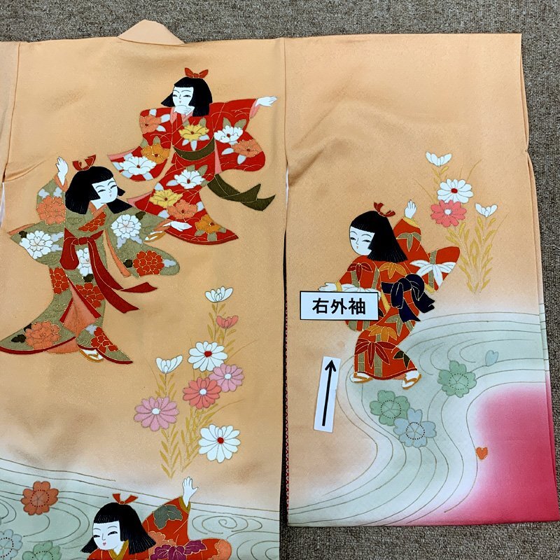 | □お宮参り 女児 祝い着 着物 産着 掛け着 七五三にも 淡いコーラルオレンジ□状態良好 *こちらは、掛け着のみです。(長襦袢は付いておりません) 淡いコーラルオレンジ・つつじ色系などの地に、金彩が施された女の子が舞踊をしている柄の可愛らしく珍しいお宮参り用の女の子のお祝い着です。うそつき袖付き。 USED品で、右外袖の矢印部分にうっすらシミがございますが近くで見ないと分からない程度です。 【素材】(着物)正絹 【色】淡いコーラルオレンジ・つつじ色系 *モニターによって色味は実際と異なる場合がございます。 【サイズ】(着物) 裄:45cm、袖丈:56cm、身丈(肩から):96cm *素人採寸のため、多少の誤差はご容赦ください。 お宮参りの掛け着としてはもちろん、七五三の3歳のお祝い着としては、お直しや被布と草履などのお小物類をご準備ください(肩上げ、腰上げは手縫いで簡単にできます) 。 | |