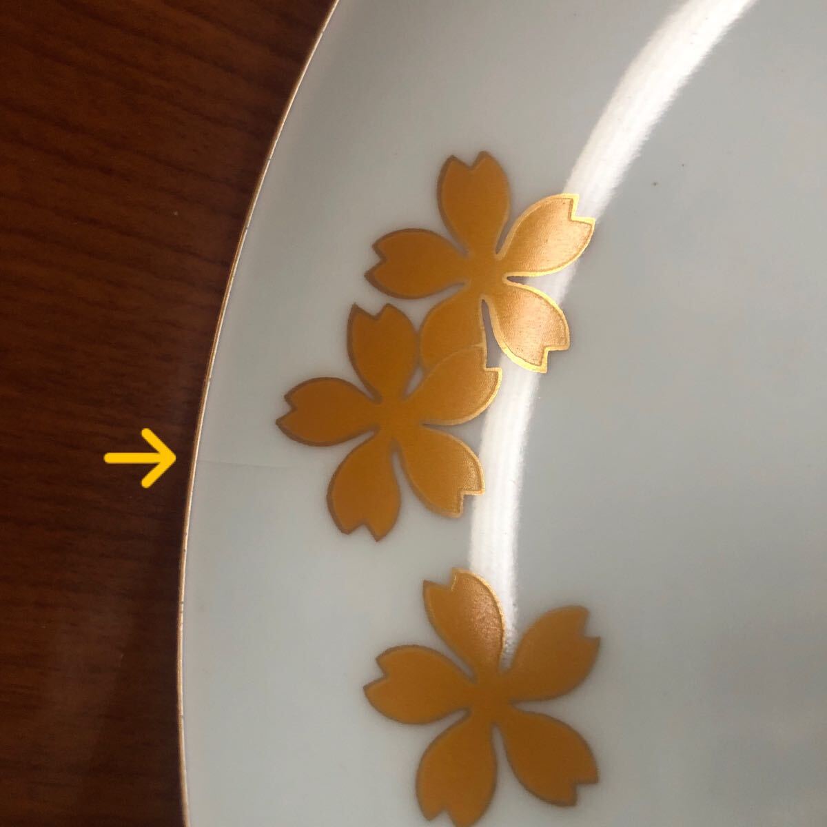 〈重要〉写真6のとおり7mmの亀裂が1箇所(裏の赤には及んでいない)、写真7のとおり色抜けが2箇所あり。構わない方に→「やや傷や汚れあり」とした