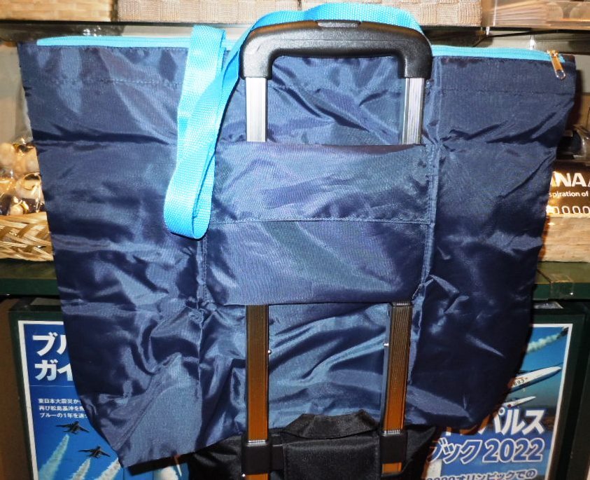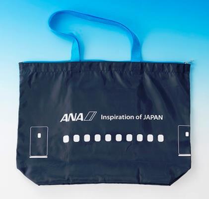 ANAキャリーオントートバッグです。サイズは広げた時52cm×40cmマチ12cmです。畳んだときは20cm×17cmです。折りたたみ式で、コンパクトになり携帯に便利です。外側のオープンポケットの中に収納できます。キャリーケースのハンドルバーに通せますので、移動するときもバッグが落ちません。クロネコゆうパケット便で発送できる数は1個までです。2個は別送でのクロネコゆうパケット便か宅急便コンパクト扱いになります。3個以上ですべてご同梱で発送する場合は宅急便60cm以内になります。