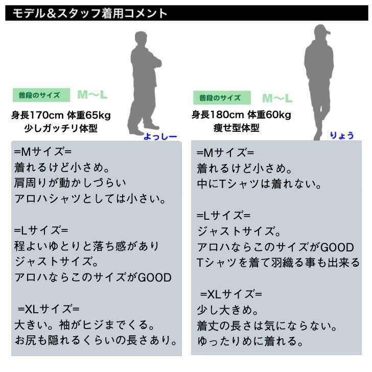 | 商品説明 | さらっとした涼しげな素材でとろみと落ち感が かっこいいアロハシャツ サイズ:XL 状態:新品 素材:レーヨン100% XLサイズ 着丈: 77cm 肩幅: 48cm 身幅: 57cm 袖丈: 25cm ※平置きでの測定になりますので多少の誤差はご了承下さい。 ◎サイズ感として◎ 当店スタッフ(男性 身長170cm 体重65kg 少しガッチリ体型) =Mサイズ= 着れるけど小さめ。肩周りが動かしづらい。 アロハシャツとしては小さく中にTシャツを 着る事が出来ない。 =Lサイズ= 程よいゆとりと落ち感があってジャストサイズ。 ちょうどいい感じ。中にTシャツを着て 着ることも出来る。 =XLサイズ= 結構大きめで、袖が肘まできて お尻も隠れる くらいの長さ。 |