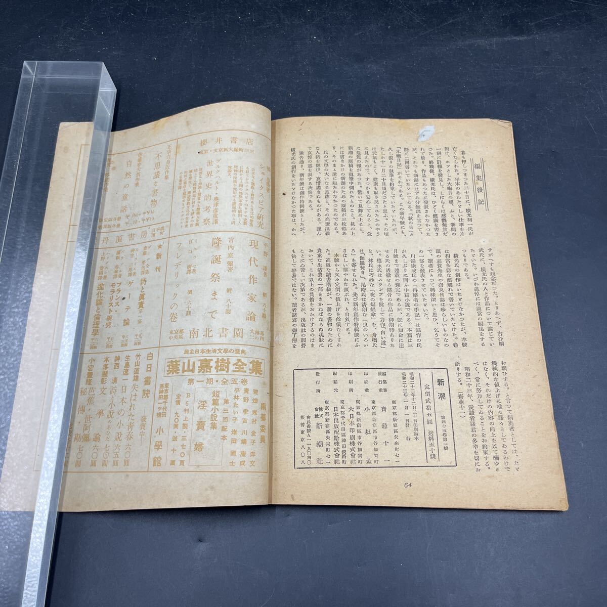 『新潮 昭和23年1月』奈良日誌/志賀直哉 虫のいろいろ/尾崎一雄 夜の蝙蝠傘/林芙美子 白い道/徳永直 舟橋聖一 川端康成 逝ける横光利一 收藏