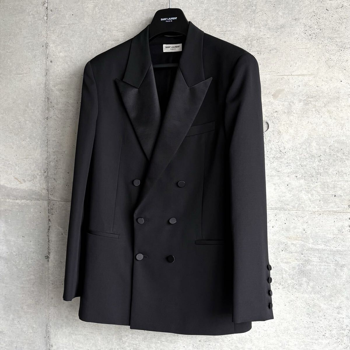 極美品 SAINT LAURENT PARIS 23SS TUXEDO JACKET IN GRAIN DE POUDRE ブラック サンローラン メンズ テーラードジャケット ダブル 50サイズ 收藏