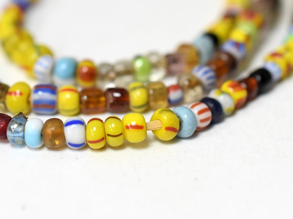 交易品としてアフリカへ渡ったヴェネチアやボヘミアのアンティークビーズミックス一連です。黄色のカンネッテビーズ(縞模様のビーズ)や透明ビーズを多く含む一連です。アクセサリー製作のためのパーツ等に便利です。状態は概ね良好です。写真はサンプルですが、ほぼ同等のものをご用意致します。連によって、多少色目や模様等に個体差があります。