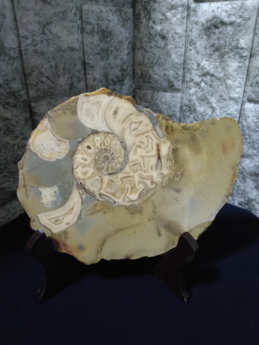 #アンモナイトスライス化石[台座あり] アメリカ産 大きさ約165㎜X130㎜ 最大厚さ約18㎜ 約503.5g 天然石の為、ヒビ、欠けあり。配送は、郵パック発送になります。