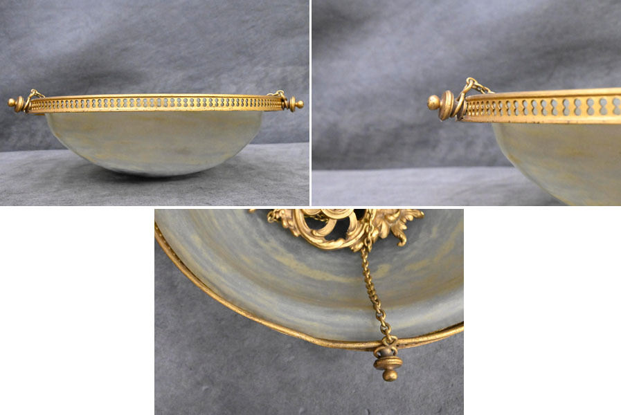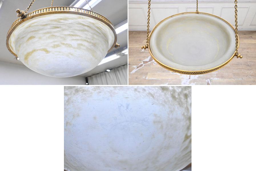 ----------------------------------------------------------------------------------------- ●送料や注意事項は必ずご確認下さい。落札後にトラブルになるケースが増えております。● ◆コンディションは写真・文章にて記載して有りますが、全てのキズの写真は掲載致しておりません。大きなダメージを除き見落とし、記載漏れが有る事はご了承下さい。 ◆当サイトにて出品する商品は多種多彩で、当方商品知識の無い物も多数ありますので落札後の質問やメンテナンス等にはお答えできません。 ◆入札された時点で、画像、文章をご理解していただいたものと判断させていただきます。不明な点は前もってQ&Aからお願い致します。入札後の質問やお電話等でのキャンセルは一切受け付け致しません。 ◆商品説明に「ノークレーム」と記載しているものに関しては、如何なる状況で届いても保証致しません。詳しくは注意事項の「商品到着後について」の最後に記載しておりますのでご確認下さい。 ---------------------------------------------------------------------------------------- イタリアアンティークの上質ガラスを使用した素晴らしい傘と吊り金具セットの出品です。 電気系統は付属しません。画像であるように見えますがお間違いのようお願い致します。 金具は真鍮の無垢材で作られているため、重厚感もあるでしょう。 フレームに変形、シェードにキズ、シミ、その他キズ、汚れがあります。 幅37x35 高66(金具迄)cm | ||