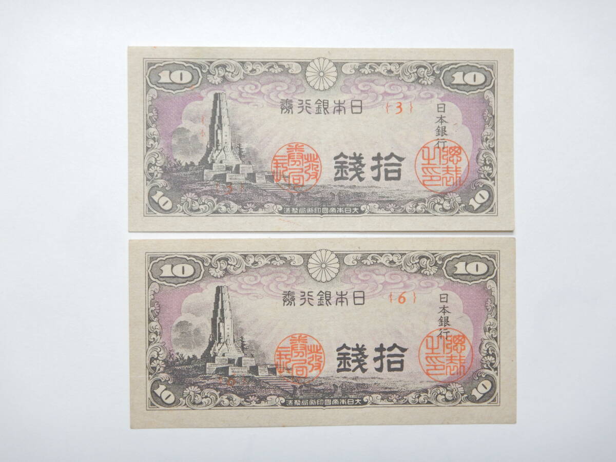 【美品】日本銀行い号券10銭 八紘一字塔10銭 拾銭 十銭 ピン札 紙幣 古銭 コレクター放出品 2点セット【1000円スタート】 收藏
