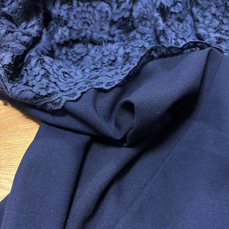 ミモレ丈のワンピースは落ち着いたネイビーカラーで、結婚式やパーティー、
