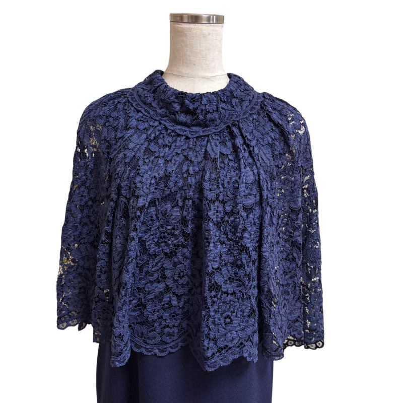 エレガントなレースケープがセットになったデザインで、肩まわりを上品にカバーしつつ