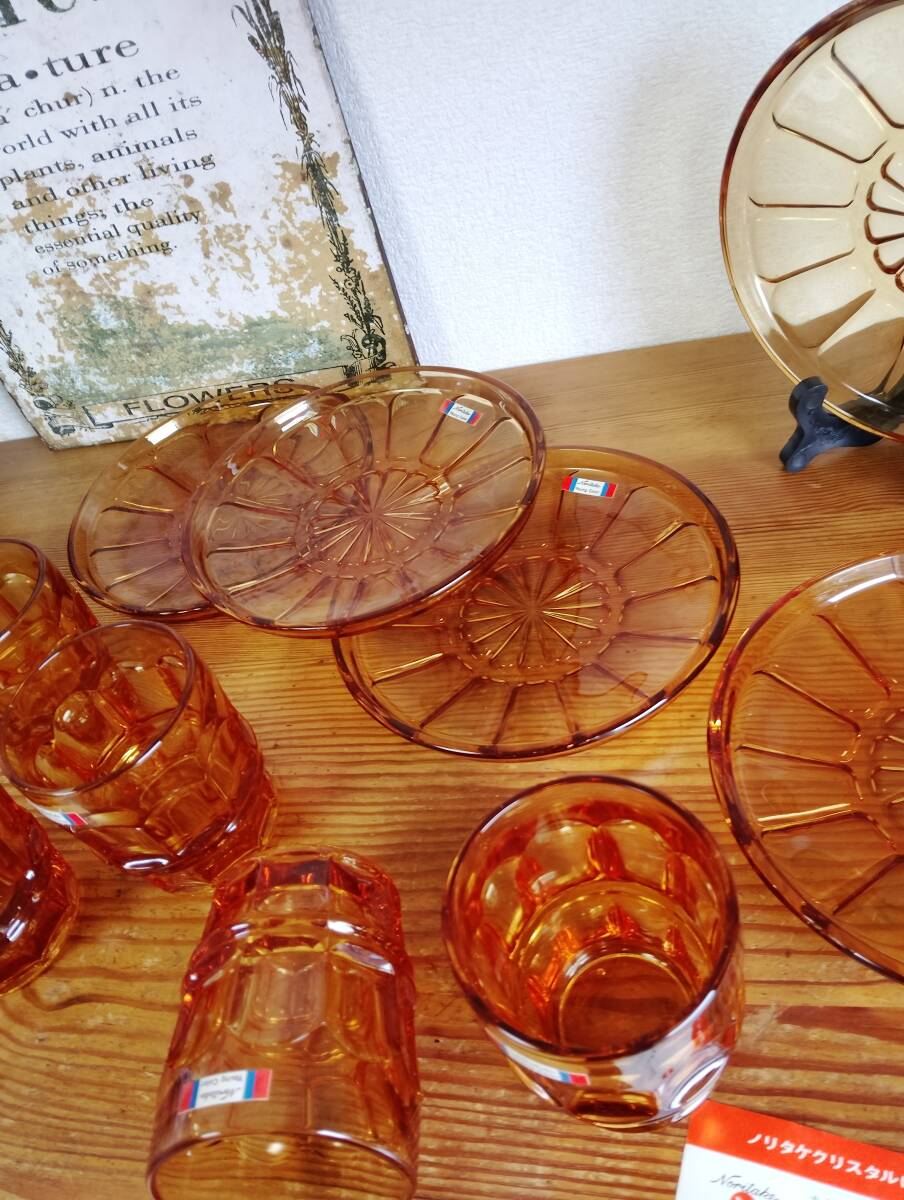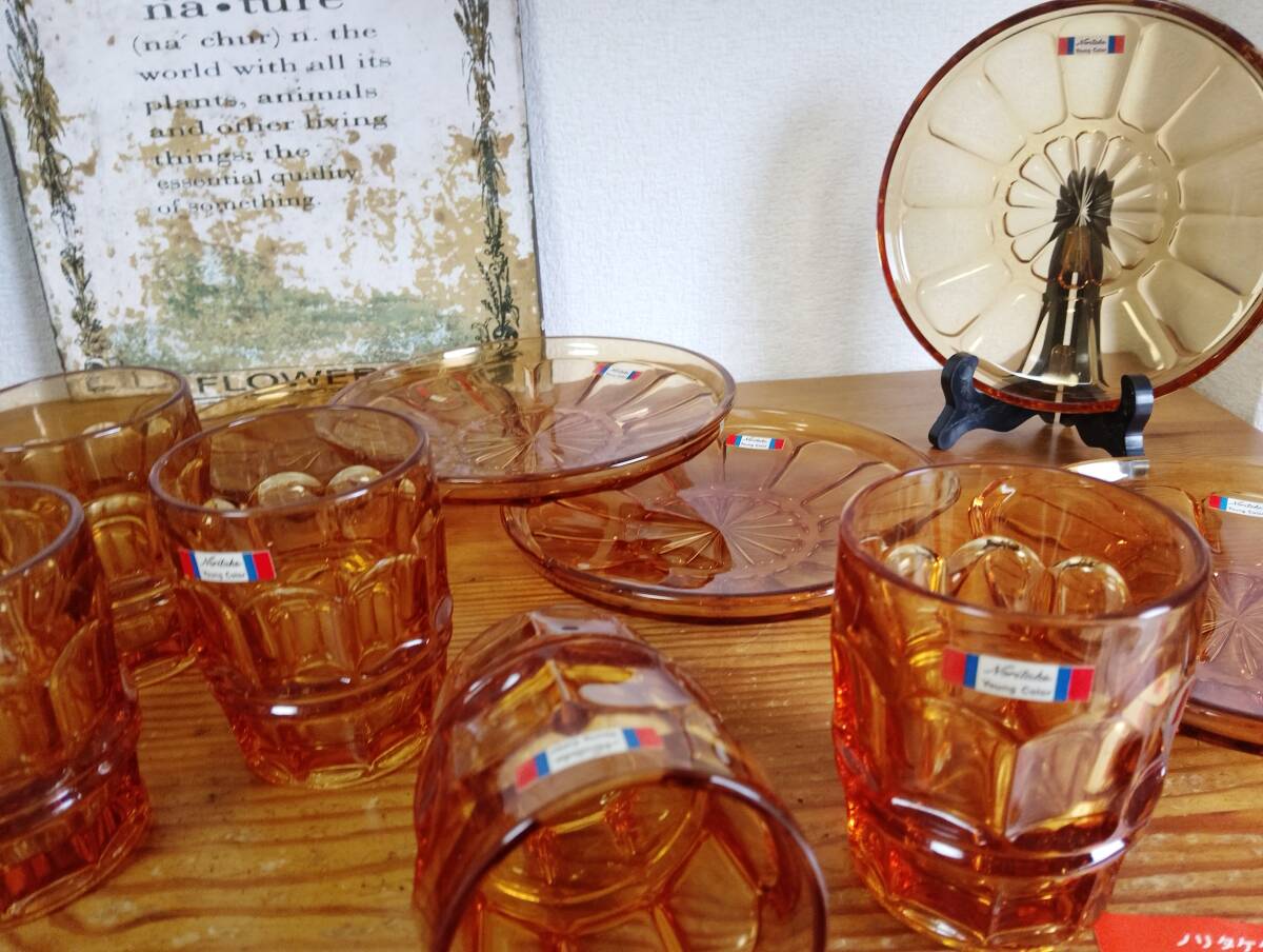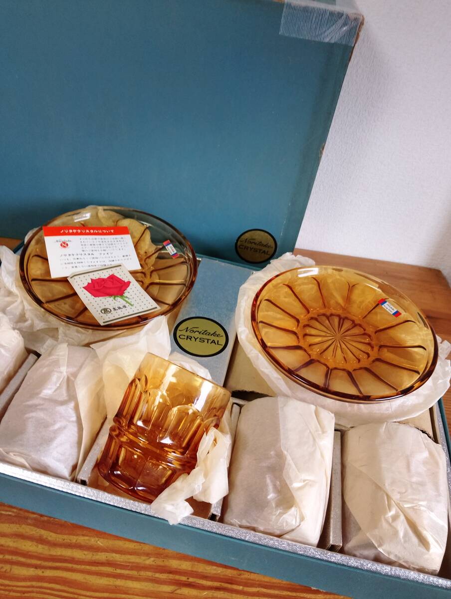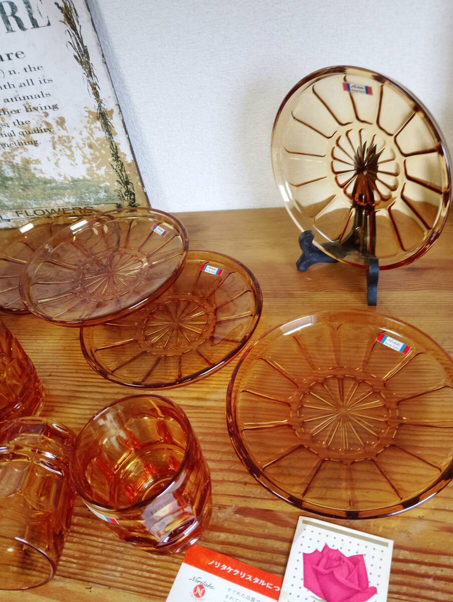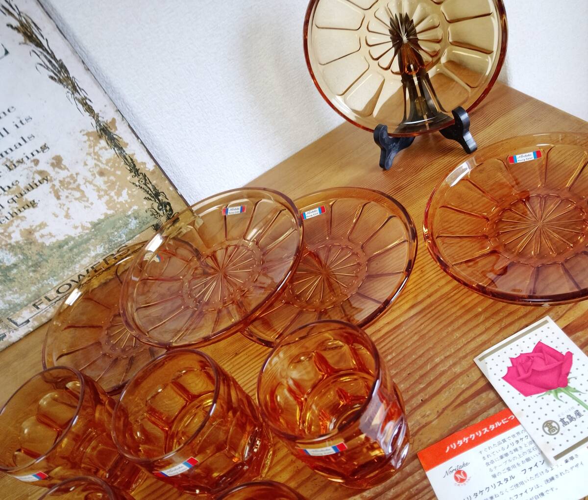 ■【新品】レトロ ノリタケ クリスタル アンバーガラス ゴブレット & デザート皿セット 12ピース 收藏